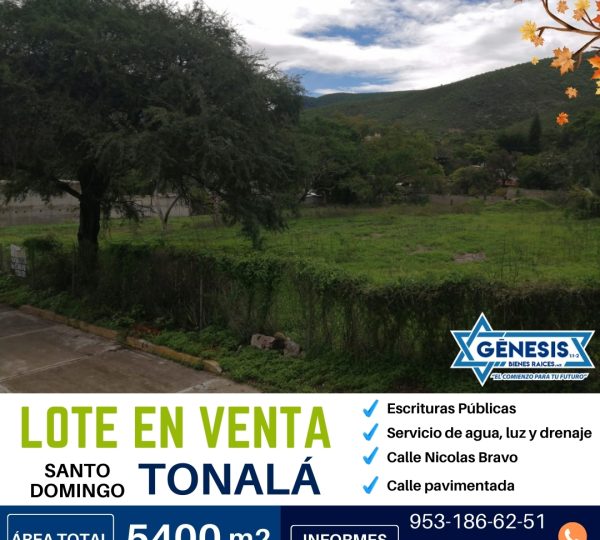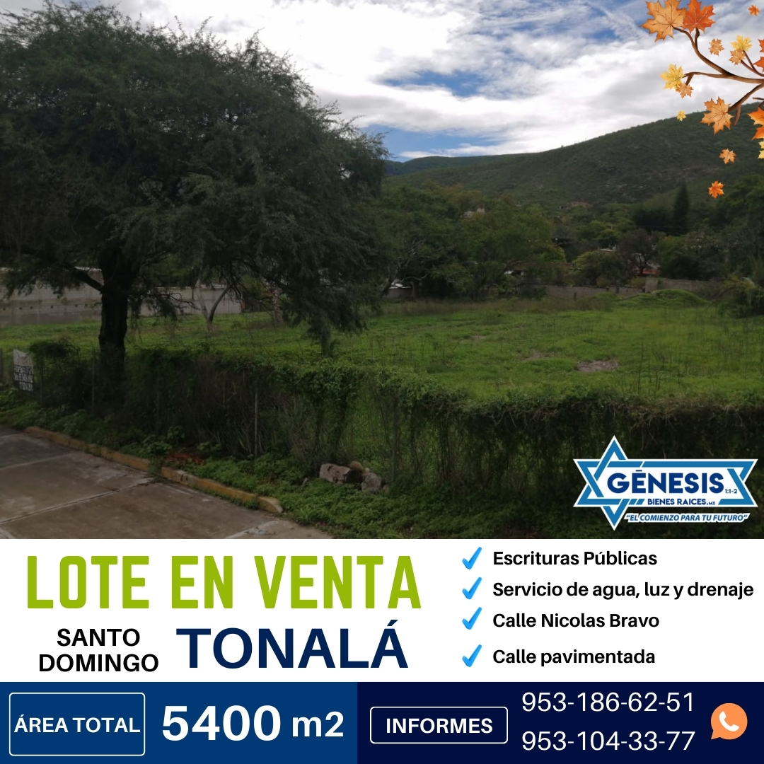 ¿Buscas un espacio amplio y versátil en el centro de Santo Domingo Tonalá? Este lote de 5400 m² es ideal para quienes desean invertir en una propiedad con excelente acceso, servicios listos y una ubicación envidiable.